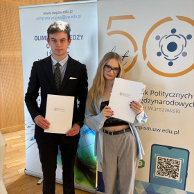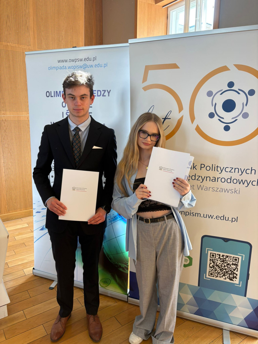 W dniach 28–29 marca 2026 r. odbył się etap centralny 50 jubileuszowej edycji Ogólnopolskiej Olimpiady Wiedzy o Polsce i Świecie Współczesnym. Z ogromną radością informujemy, że Julia Pasternak z klasy 4g uzyskała tytuł laureatki, natomiast Aleksander Piłat, również uczeń klasy 4g, zdobył tytuł finalisty. Oboje tym samym zapewnili sobie maksymalny wynik – 100% z egzaminu maturalnego z wiedzy o społeczeństwie.
